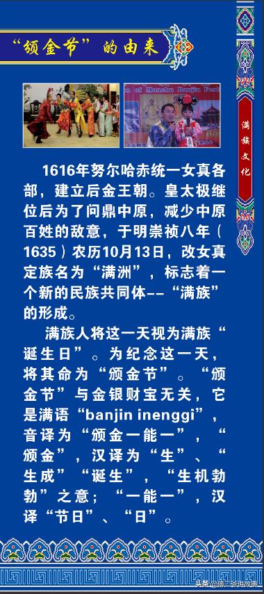 颁金节是我们满族特有的节日,满族人及其祖先世世代代生活在东北的这片白山黑水间,创造了璀璨的文明和历史,公元1635年农历的十月十三,清太宗皇太极发布谕旨,将族名女真改为“满洲”,从此农历十月十三被我们称为了“颁金节”。
