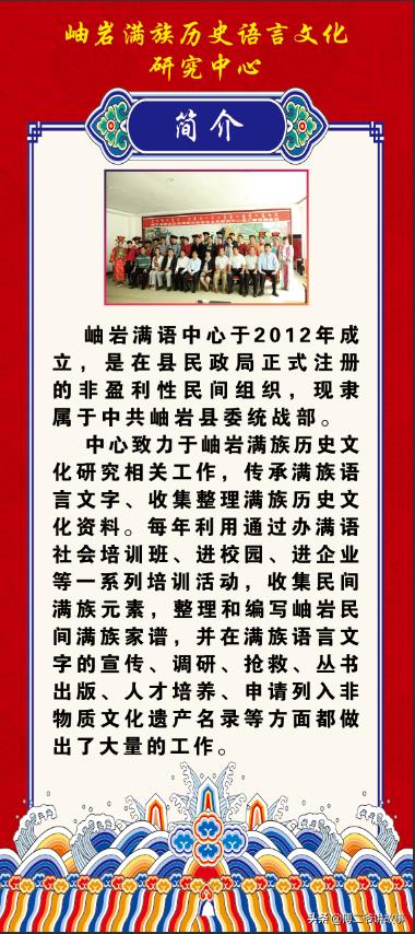 本次典礼由岫岩满族历史文化研究中心主办,该中心成立于2012年,多年来,中心一直致力于满族语言及文化的传承,使岫岩的满语学习从无到有,从有到多,吸引越来越多的人学习,关注满族语言、文化,并逐渐扩大影响。