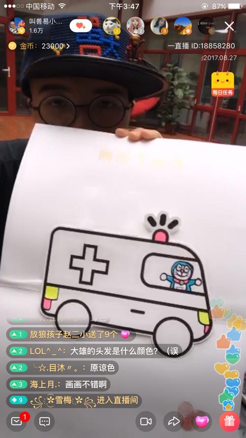 上色开工前,叫兽易小星对自己的画技自信满满,与网友互动,“叫兽教你画救护车”小课堂正式开课。首先,叫兽易小星的涂色颇有特色,在色彩选择方面,他根据积极助力公益的粉丝送出的礼物颜色来,实现与大家一起涂鸦救护车。他看到粉丝“黄文煜小盆友”打call,便采用粉丝id里的黄色,给救护车画了两盏灯;看到粉丝送出马卡龙,灵机一动选择“把轮子画成马卡龙的颜色”,希望自己画的救护车是一辆“满载甜蜜的爱心车”,一个轮子画蓝色,一个轮子画自己最爱的粉红色,简直少女心和爱心都满满。并且,他还对每一个颜色做了自己的解释:“绿色是代表生命的颜色”“蓝色代表着peace和love”。段子手的功底简直了得啊!