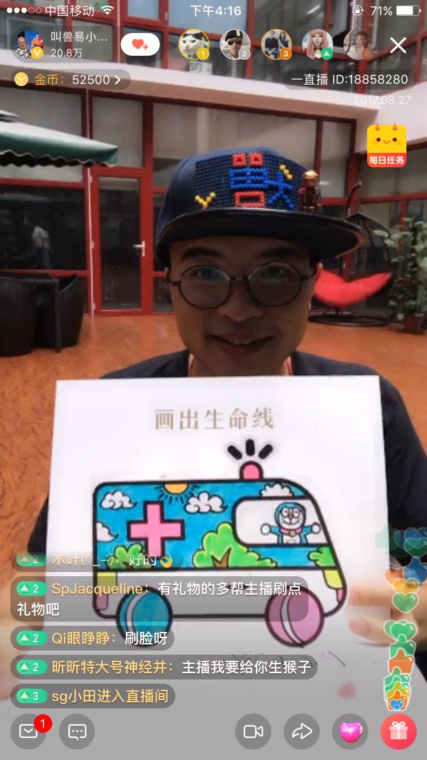 叫兽易小星做起公益来也是毫不含糊,实实在在。8月27日下午,易小星现身一直播,参与“画出生命线”线上公益活动。这是由一下科技和2017芭莎明星慈善夜联合发起,明星直播涂鸦救护车立体贺卡,由网友打赏点赞所获的全部收益将悉数捐赠给“为爱加速”思源·芭莎自治区救护车项目,从而将救护车由纸片化为现实,去到最需要的地方,为当地患急症的同胞百姓多争取一些黄金救助时间,让生命和希望得以延续。40余分钟的直播里,叫兽易小星开启了Freestyle涂鸦模式,视频已收获180万观看量!
