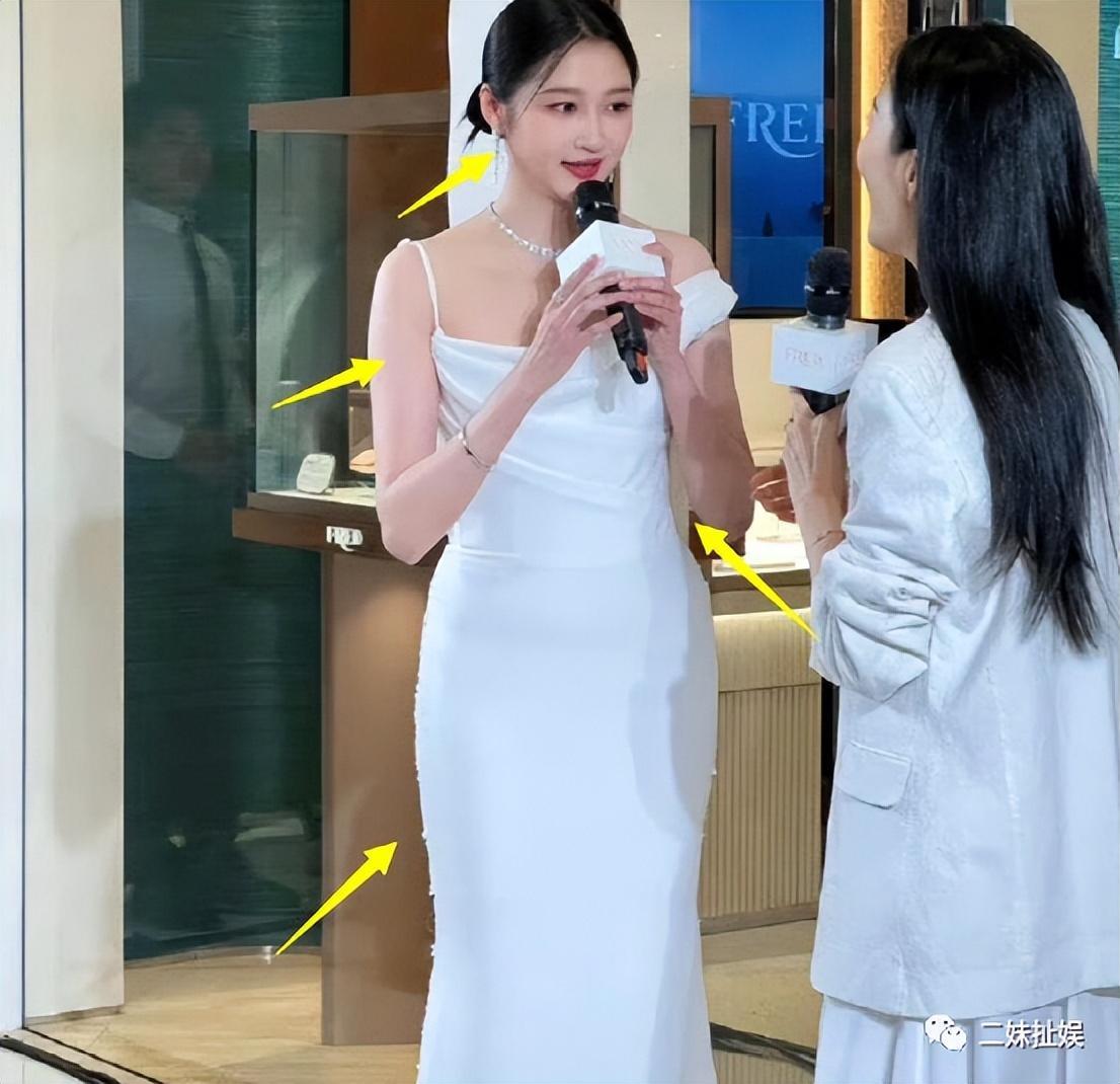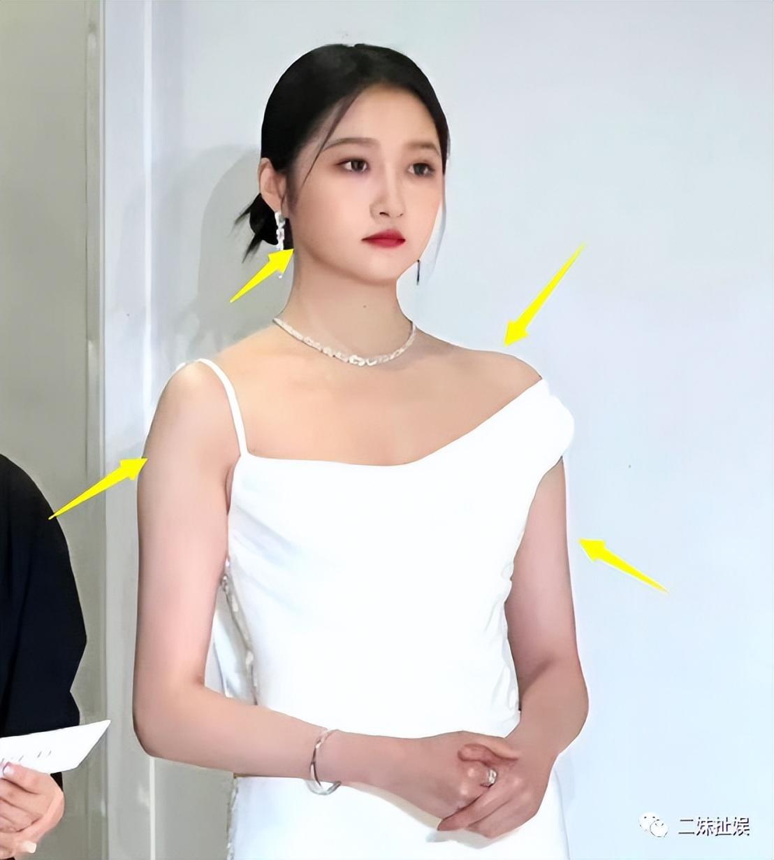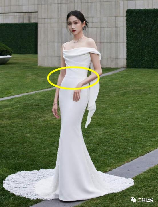 在现场拍摄的未经修饰的照片中,关晓彤的身材似乎变大了几个号,不仅脸颊变圆了,手臂也粗壮了许多。这件礼裙完全看不出她的腰身,从上到下都感觉到宽阔的胯部,与修图中的身材简直判若两人。
