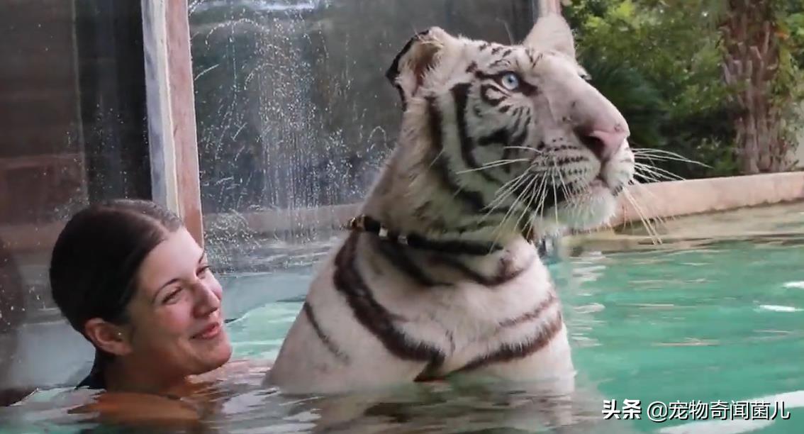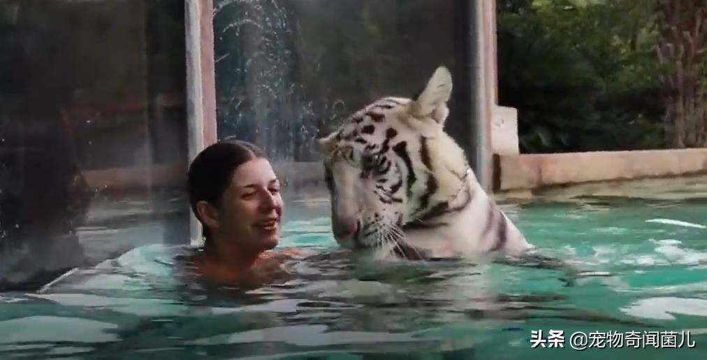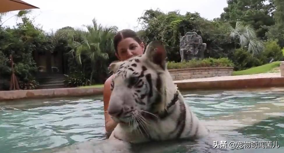 妹子二话不说带着狗子,哦不是大老虎,就往泳池冲去,一人一虎在泳池里玩的贼开心,也不知道此时老虎的内心想法是个啥,估计在想这个主人是不是傻。
