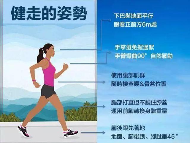 有点喘+能和别人说话的速度健走速度应每小时4.8-6.3公里,相当于每分钟90-120步,健走不但能促进心肺功能,而且能增加骨质密度、改善肌力及平衡,进而可防止跌倒的发生。林立峰技术长指出,健走不是散步,健走是必须要有一点速度,有点喘以及能和别人说话的速度,这样才能达到健走的目的。3不可弯腰驼背+快步走+脚跟先着地健走姿势也要注意,健走不可以弯腰驼背,否则会腰酸;另外,健走要加快速度,往往膝盖会酸痛,所以膝盖要保持弹性,不要跨大步,而是要快步走;此外,健走要脚跟先着地,接下来才是脚掌,这才是正常步态,因为脚尖先着地,就会对膝盖不利。
