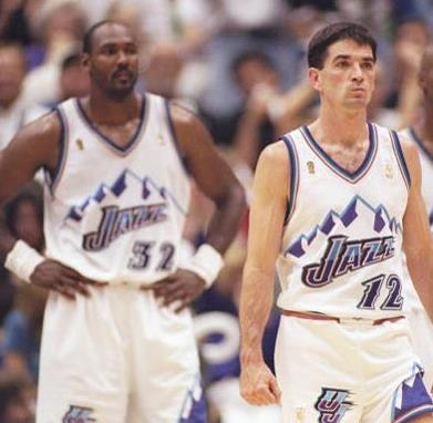 战术运作:斯托克顿和马龙站在场上左侧边线的位置,而其他三名球员则站在右侧。然后马龙移动到罚球线附近,斯托克顿带球跑至他身边,从旁边饶过去。防守斯托克顿的球员就会撞在掩护的马龙的身上。战术结果:现在,斯托克顿处于无人防守的状态。他再次带球至罚球线附近,吸引防守马龙的球员注意力,在对方球员双人夹击的情况下,斯托克顿眼疾手快地将球迅速传给早已奔至蓝下的马龙,后者轻松上篮得分。