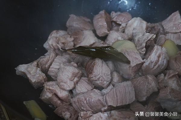 4、热锅热油,加入香叶,蒜蓉,姜片炒香之后加入肉块一同炒