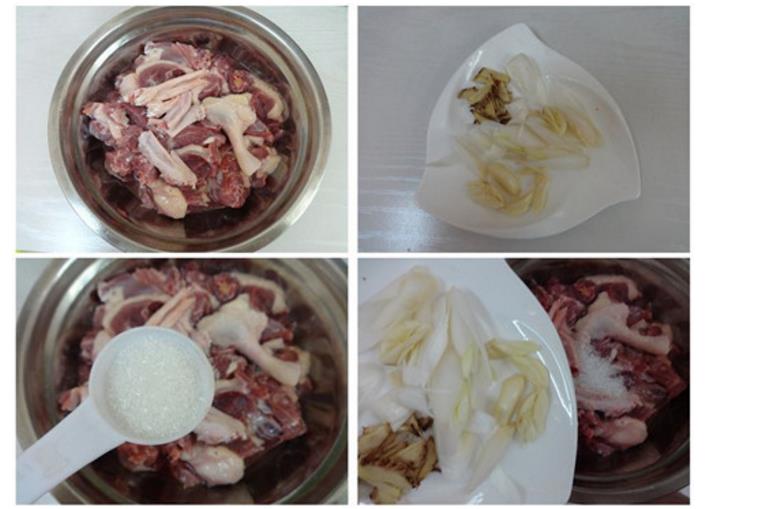 3、鸭块中到场适量的盐、糖、料酒、蚝油、生抽、老抽,再到场姜葱蒜,用手抓匀后入腌制一段时刻