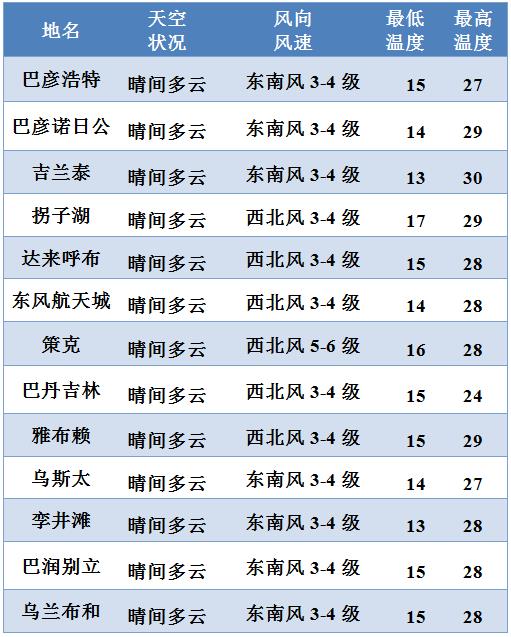 10月1日:晴间多云,额济纳旗西部西北风5-6级,额济纳旗东部、阿右旗大部西北风3-4级,其余地区东南风3-4级。