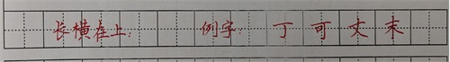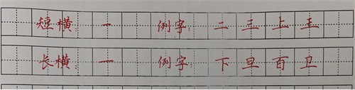 一、横画分为:长横和横短,但不管长、短横,书写时都稍微要呈左低右高之势, 在书法上叫“扛肩”。