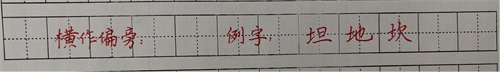 4.横作业偏旁部首时,书写时在保持左低右高之势的同时,如果横在下面,则横要变提,如地、圳等。