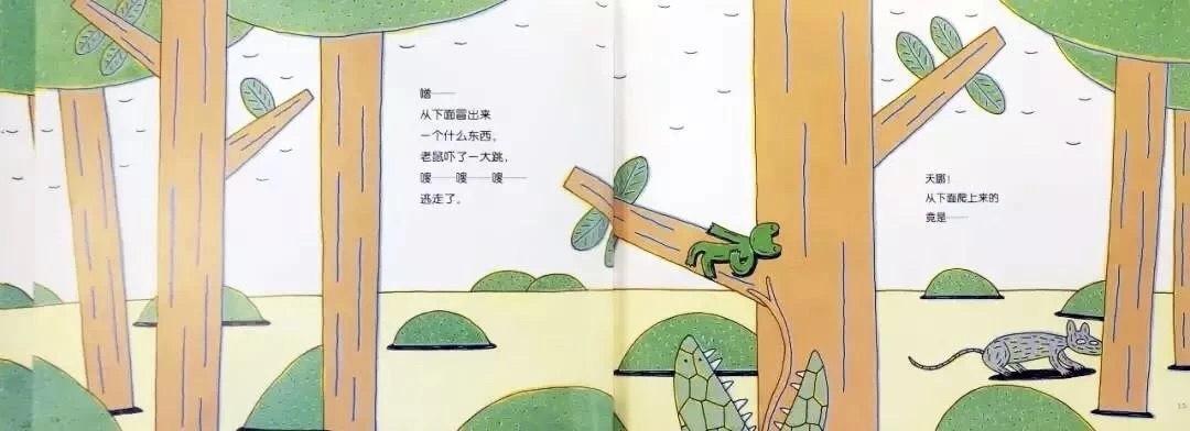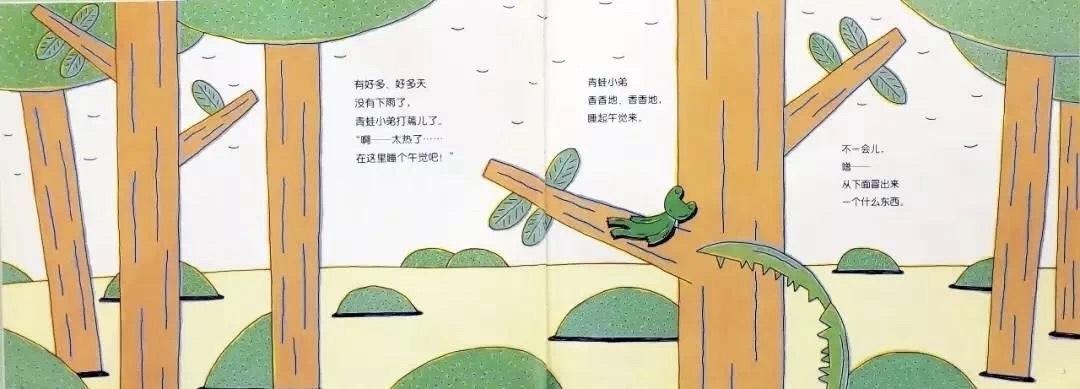 哇——蜥蜴!可是,青蛙小弟还在呼呼大睡。蜥蜴吧唧吧唧地咂巴着嘴巴,朝着青蛙小弟扑了过去。就在这时——