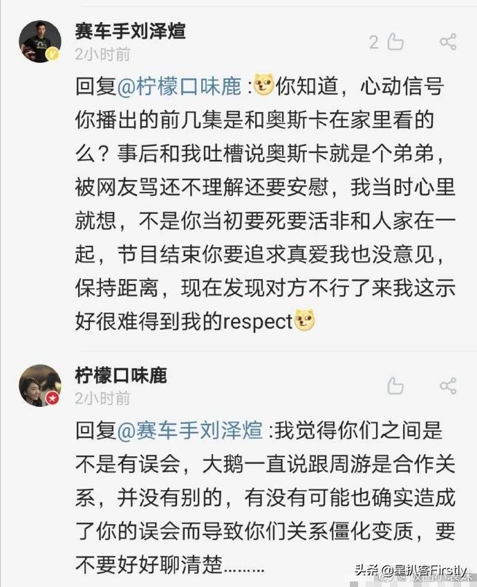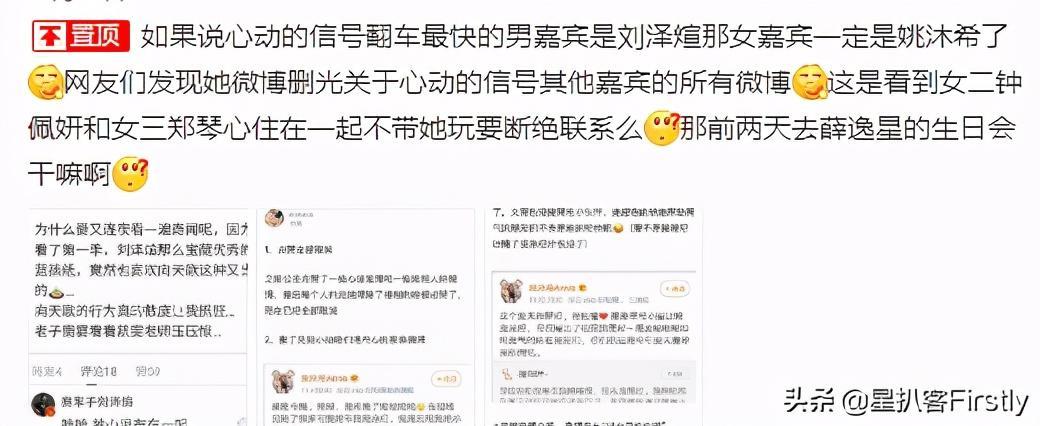 互撕的起点大概是,第三季节目中的姚沐希小姐姐在官宣和彭措没有走到一起之后的几天,删除了关于小屋的几乎所有动态,被网友质疑不合群。紧接着有吃瓜网友联想到第一季的女嘉宾向天歌在节目中和多位男嘉宾的互动,直言她也是位绿茶,并说很幸运刘泽煊没有和她在一起。