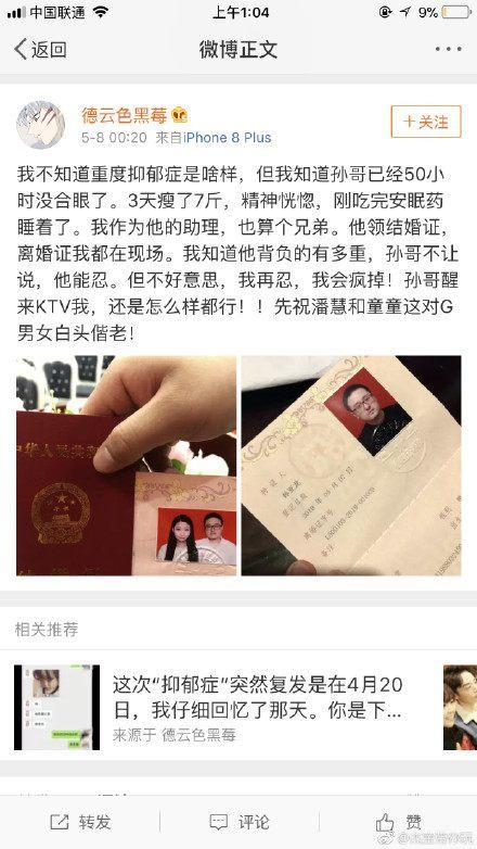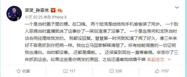 本以为事情发展到这个地步已经尘埃落定,大家也对色长的遭遇感到惋惜,同时为慧慧的病情祈祷平安。不过在今日5月8日凌晨孙亚龙的助理伊相杰发出了一条微博。大致意思就是慧慧只是借着抑郁症的借口,跑去深圳见男网友去了。换而言之就是你们的孙哥被绿了...
