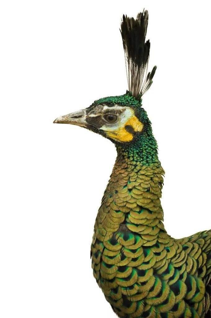 鸟尊头上有竖状高冠,冠呈扁圆型上宽下窄,冠上作丝状纹饰。而绿孔雀头上也有一簇向上竖立顶部微微散开的羽冠(簇状羽冠也是绿孔雀区别蓝孔雀的重要特征)。