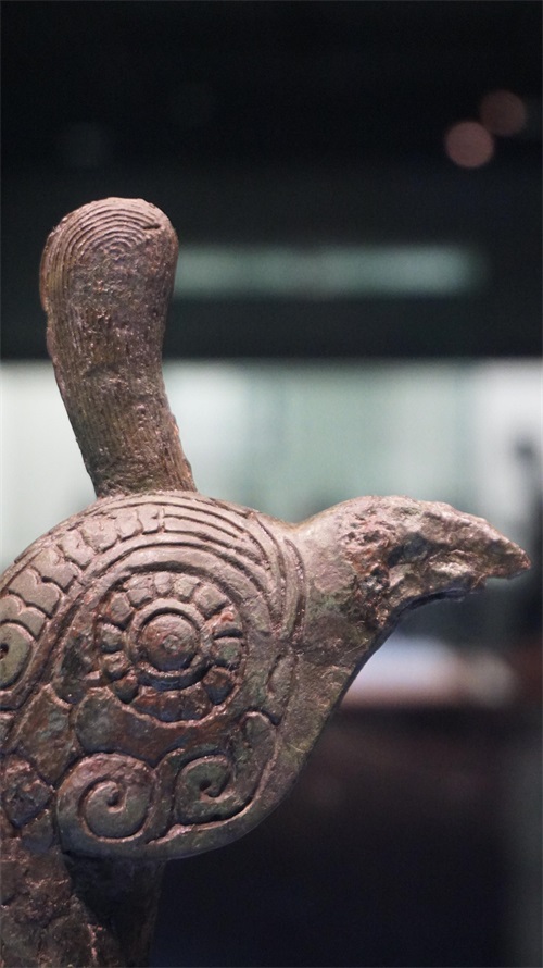 绿孔雀最明显的特征,就是颈部层层叠叠的鳞片羽毛,而鸟尊颈部的装饰也恰好是鳞纹