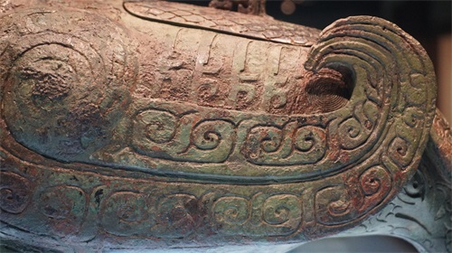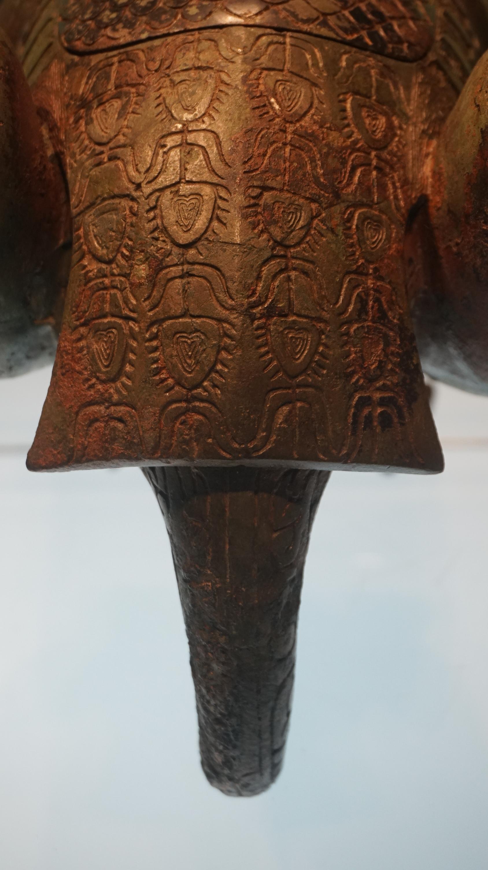 绿孔雀颈部的鳞片羽毛一路向下,完全覆盖了整个背部与腹部。而鸟尊的背部与颈部靠近腹部的地方,同样使用了鳞纹作为装饰,与颈部的鳞纹连成了一体。