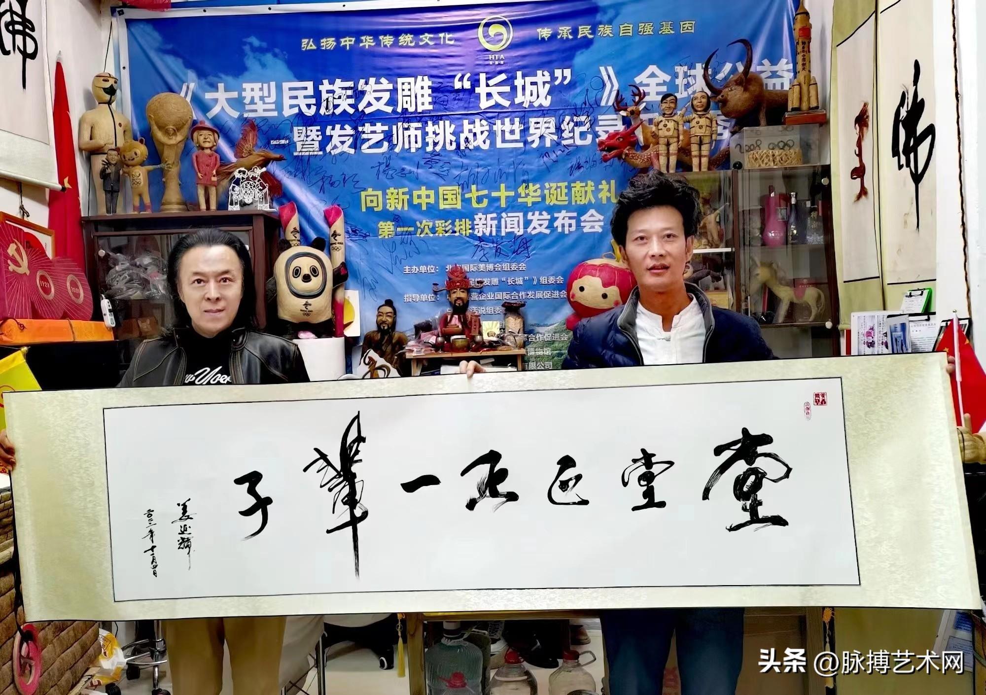 经过三个月的时间联手创作,中国头发雕塑发明家黄鑫先生终于制作完成了“堂堂正正一辈子”的民族头发浮雕艺术作品,以纪念深情寄语的历史光辉时刻。作品制作完毕后,姜延辉老师亲临中国头发雕塑发明家黄鑫老师工作室,亲笔在民族头发雕塑“堂堂正正一辈子”的艺术作品上落款,两人合影留念。在二人的沟通交流中,黄鑫先生向中国著名词曲作家姜延辉老师介绍了民族发雕艺术的主要创作过程,以及艺术表现形式方面的主要特征和收藏的历史价值。