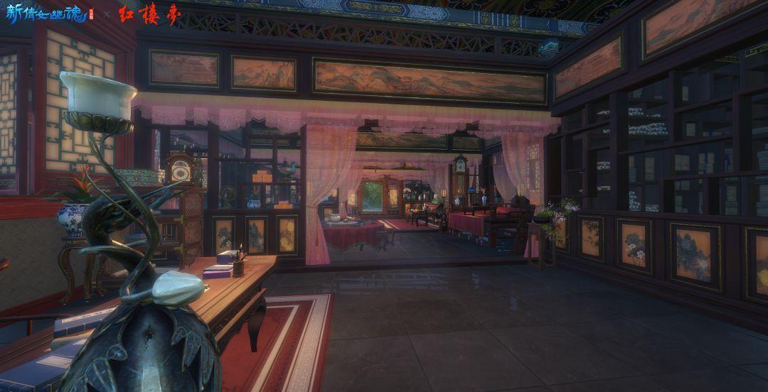 值得一提的是,本次怡红院场景力求全方位还原。依照曹公的描述:怡红院是一处精致的院落,粉墙环护,绿柳低垂。院两边抄手游廊,将院内建筑连为一体;院中央有几块山石点缀,东边数株芭蕉,西边是一棵西府海棠;东西厢房,是侍候宝玉的丫鬟婆子们所住;正北坐落一栋面阔五间带抱厦的房屋,雕镂新鲜花样槅扇门窗,外檐正中上悬挂匾额“怡红快绿”。后院有满架蔷薇、宝相,顺着石子甬路走去,便是石头砌岸的水池,上架着石板。从实机海报上不难看出,不管是在房屋布局还是外景陈设上都十分考究。
