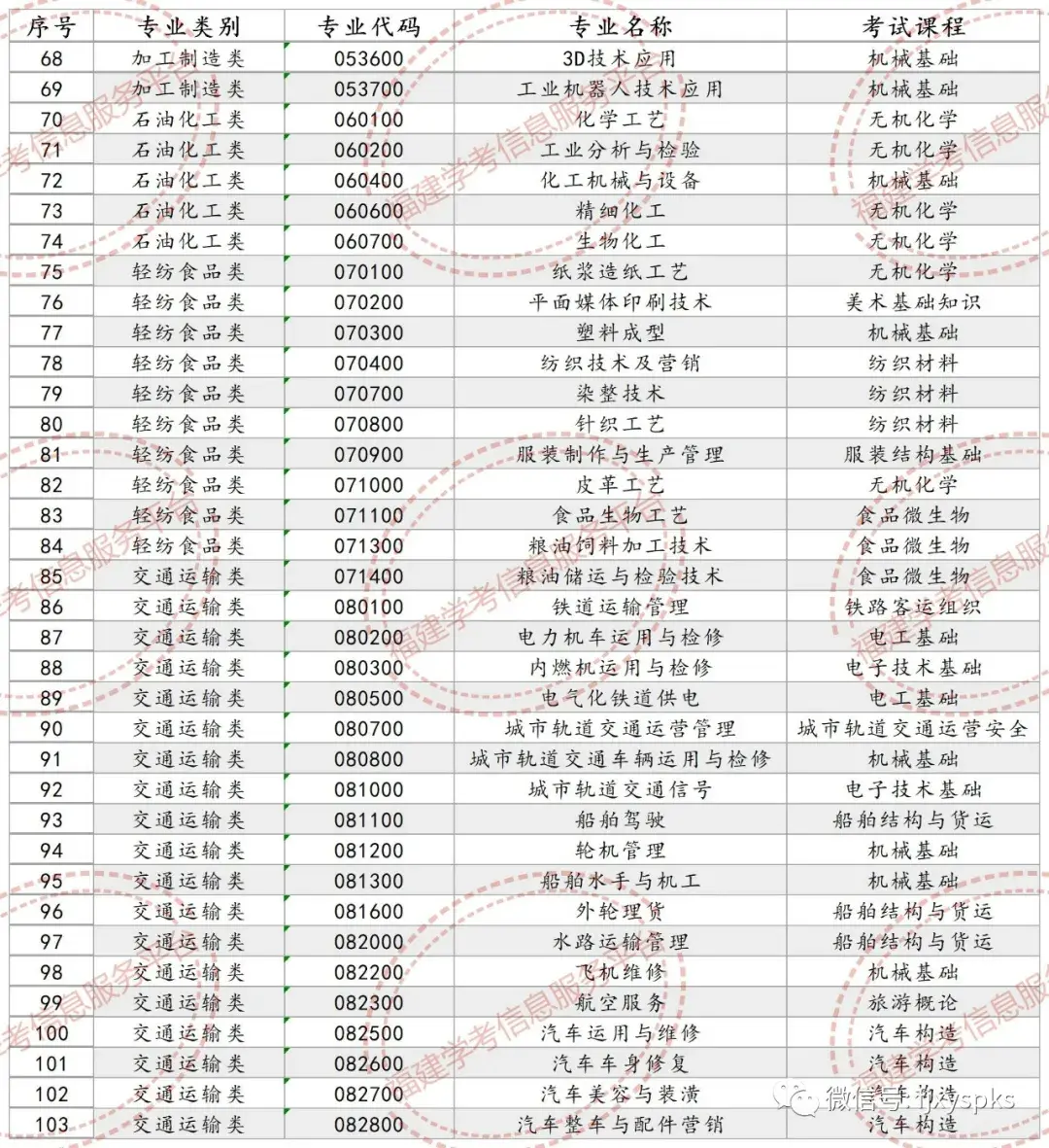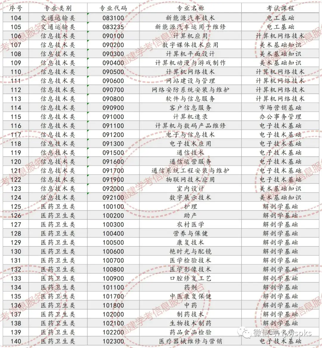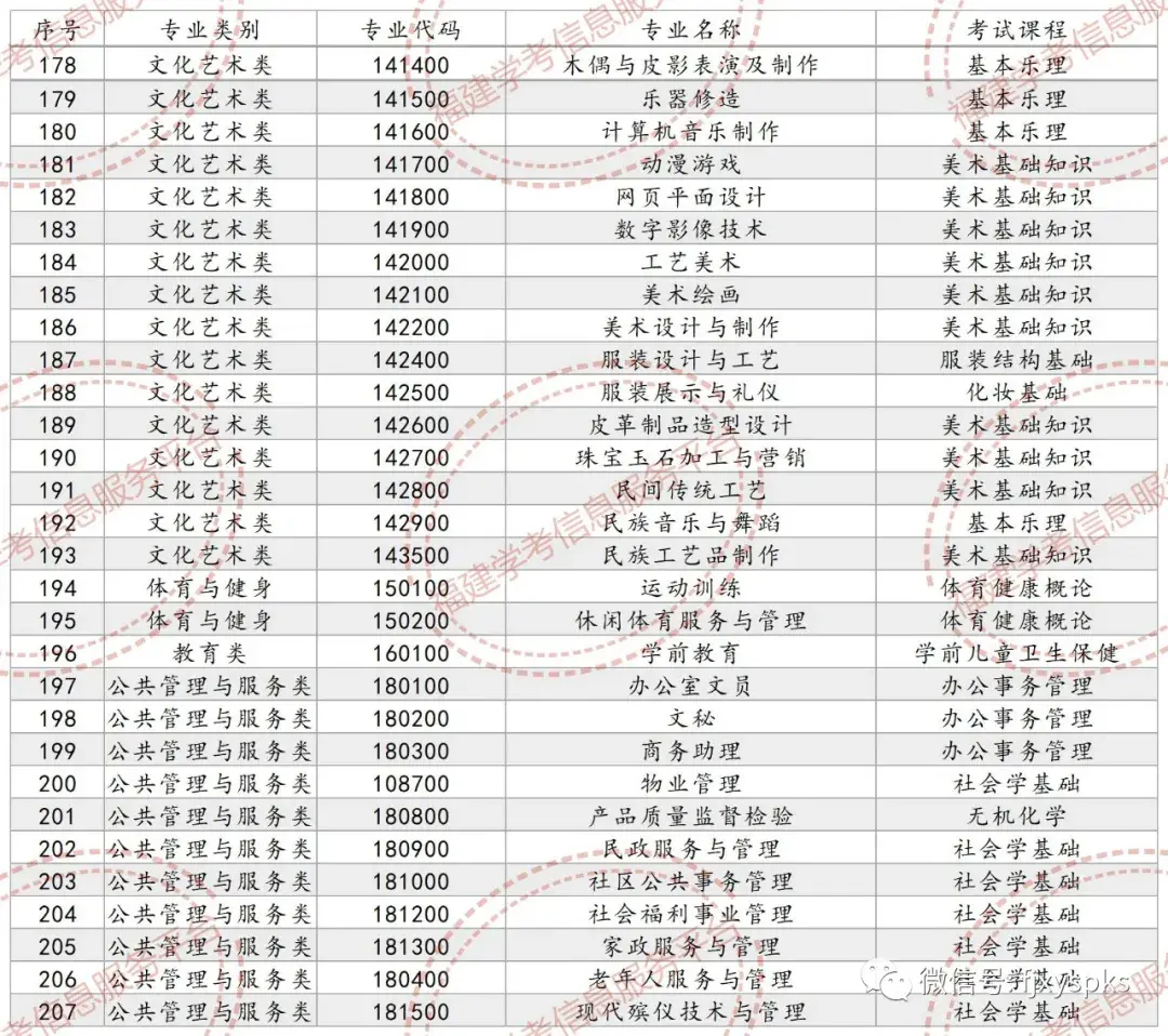 福建省中等职业学校学业水平专业基础知识考试课程与报考类别:有农林类、畜牧类、渔业类、土木工程类、制造类、电工类、电子类、化工类、纺织类、服装类、食品类、汽车类、城市轨道交通类、铁道运输类、航运技术管理类、计算机类、医药卫生类、形象设计类、财经管理类、商贸管理类、物流管理类、旅游服务类、餐饮类、美术与设计类、音乐与表演类、广播影视类、体育类、教育类、办公事务类、公共管理与服务类共计30门