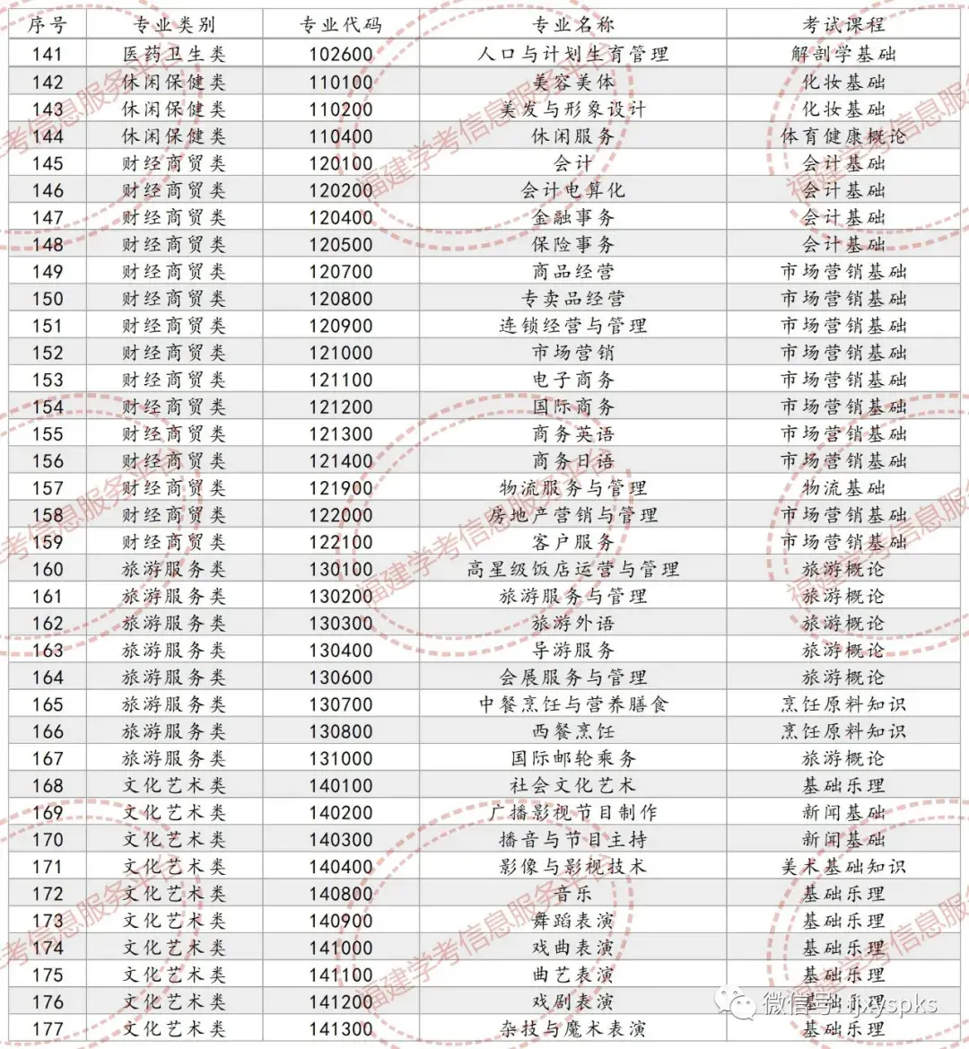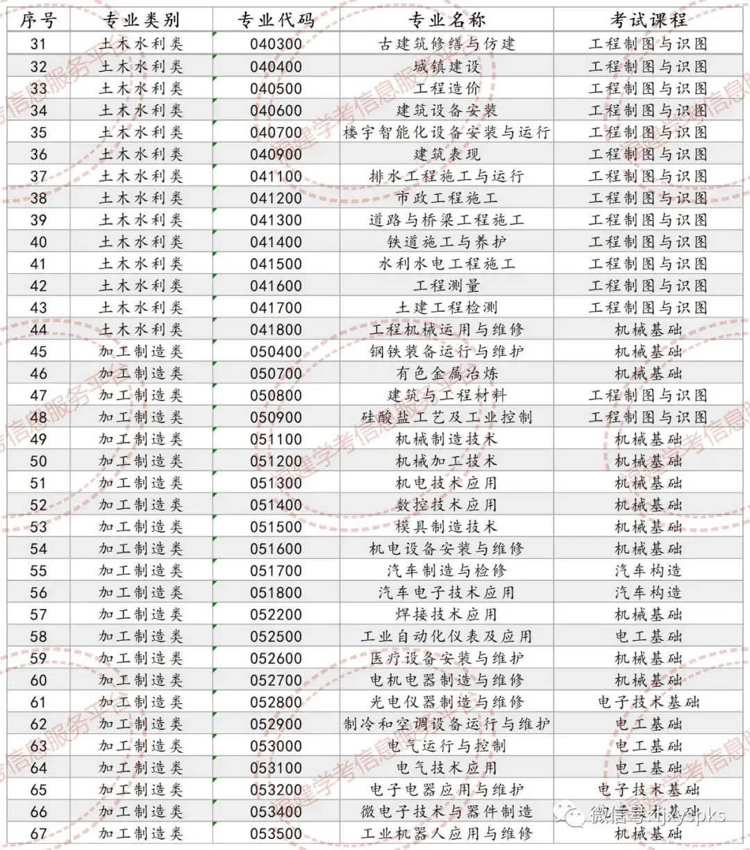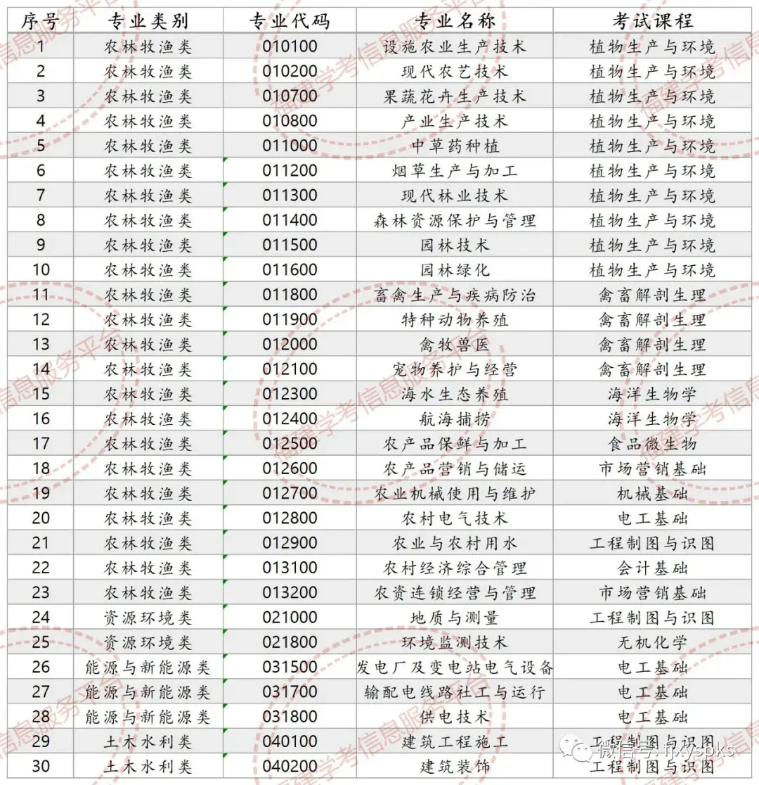 福建省中等职业学校学业水平专业基础知识考试课程与报考类别:有农林类、畜牧类、渔业类、土木工程类、制造类、电工类、电子类、化工类、纺织类、服装类、食品类、汽车类、城市轨道交通类、铁道运输类、航运技术管理类、计算机类、医药卫生类、形象设计类、财经管理类、商贸管理类、物流管理类、旅游服务类、餐饮类、美术与设计类、音乐与表演类、广播影视类、体育类、教育类、办公事务类、公共管理与服务类共计30门