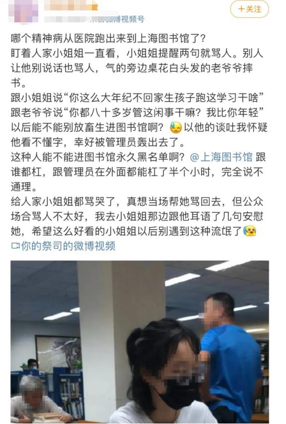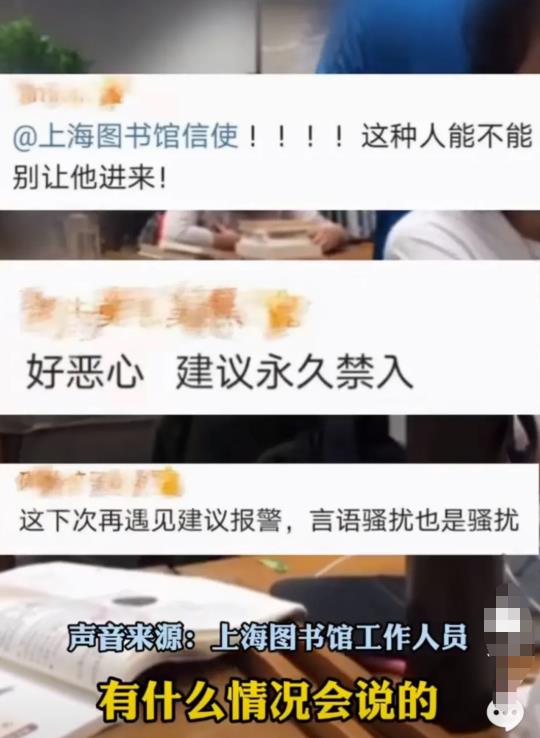 最早曝光这名男子的网友表示,该男子无差别语言攻击在场读者:“小姐姐提醒两句就骂人,别人让他别说话也骂人。”甚至当天下午,已经被请出门的该男子又出现在了上海图书馆,还叫嚣“馆长都不管我你们也配管我?”