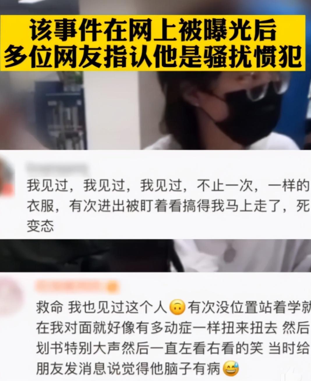 事件在网上曝光后,多名去过上图读书的网友指认,该男子是骚扰惯犯。还有网友爆料称该男子多次出现在上海图书馆,不但骚扰女读者,还一直在大力用笔划书,然后看着别人发出很奇怪的笑,让人毛骨悚然。
