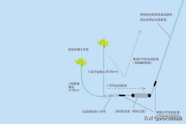 爆米花钓法有两大特点,第一就是饵料使用爆米花,其次就是爆米花不会沉底,会把鱼钩带起来,形成钓离底的效果。这样钓组搭配就是围绕着这种特殊用饵开展的,爆米花钓草鱼和鳊鱼,是民间知道人不多的钓法,非常好使。大致的钓组搭配可以参考下图,然后再详细介绍下。
