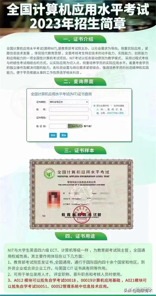 NIT证书是教育部教育考试院统一印制、颁发。证书的正面用中英文两种文字书写,印有证书持有人身份证号码、证书编号、模块名称等。该证书全国通用,是持有人计算机应用能力的证明,也可供用人部门录用和考核工作人员时参考。 各承办机构根据省内的不同情况制订了结合NIT考试的相关政策性文件,在这些省市内参加考试的学生可以按相关政策文件对其他考试的相关科目申请免考或替代,详细操作办法应依据当地承办机构相关文件执行。(在部分省份,NIT证书可以用来替代自考专科/本科中的计算机理论和实践科目)