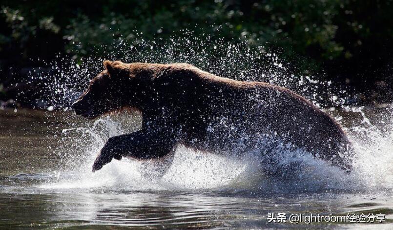 对于这张灰熊的镜头,显示熊的轮廓,只保留细节在毛茸茸的边缘,而水滴都是背光的,所有这些导致场景的简化和神秘呈现。尽管使用的是正午光,这是传统观点认为对自然摄影的用处有限,但是背光似乎仍然有效,使用了遮光罩,以防止光线直接照射在镜头的前镜片上,结果是获得清晰和明亮的图像。