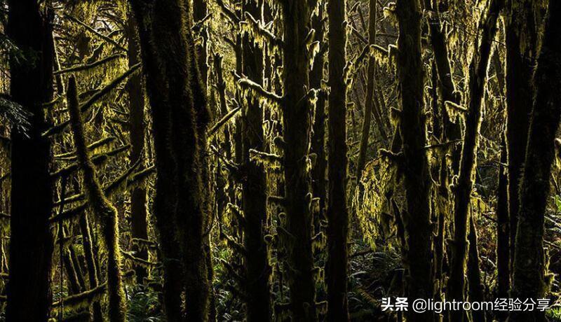 将背光对象放在黑暗背景下(通常是阴影中的场景部分)时,效果最好。对于这张雨林的照片,明亮的午间照明营造出戏剧性的边缘效果,树木的半透明苔藓轮廓似乎从内部散发出来,通过选择一个角度,使阴影的山坡隐藏在树后,能够增强效果,这使得它们似乎从背景中“掉出来”的感觉。