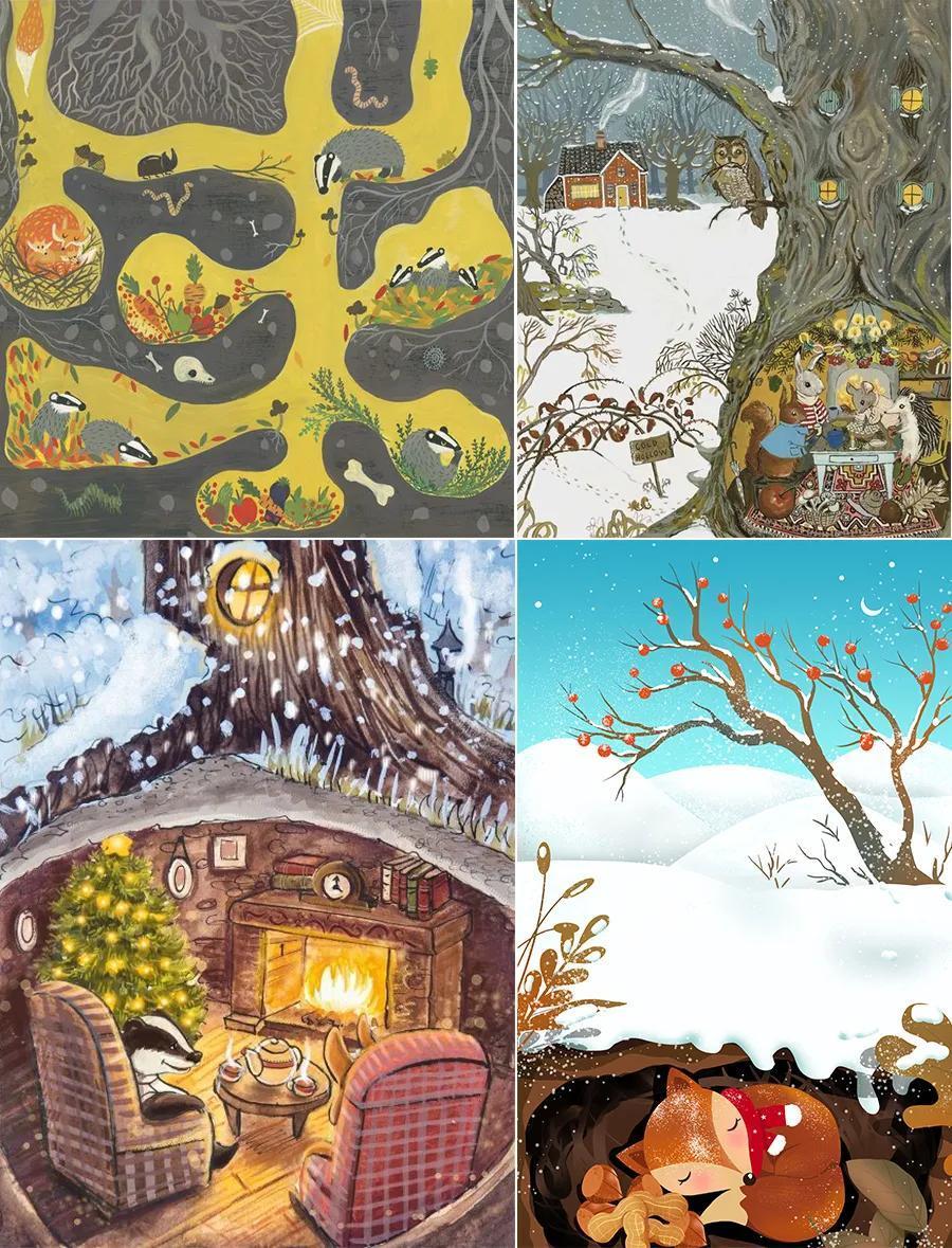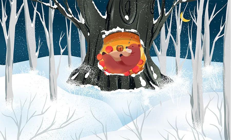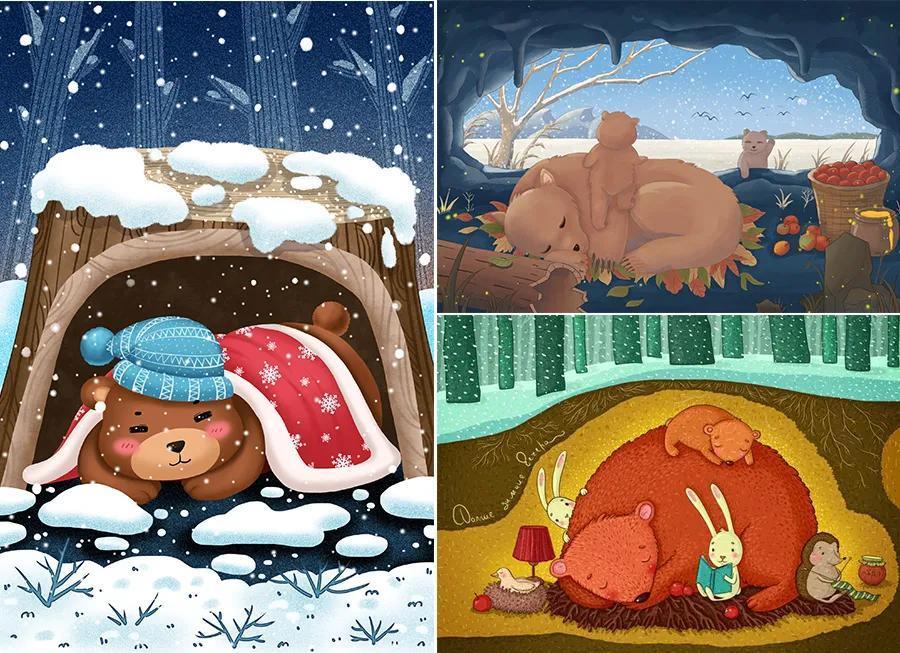 小朋友们对动物的冬眠非常感兴趣,在很多的儿童插画中,还以儿童充满想象力的视角,表现出各种动物冬眠时的场景。当外面寒风呼啸、冰天雪地之时,动物们在树洞或地穴里做什么呢?小朋友们的答案有很多,比如它们在温暖的洞穴里看书、睡觉、享受美食、举办舞会等等,这些固然是孩子们的想象,但也体现出温馨和充满爱心的一面。在今天的美术课程中,我们表现的就是冬眠的小熊,运用丰富的线条和色彩,表现小熊在洞穴里睡觉时的状态,并围绕洞穴展开地面上的场景表现,形成充满线条美和色彩美的画面。我们一起来看看参考的教程吧!