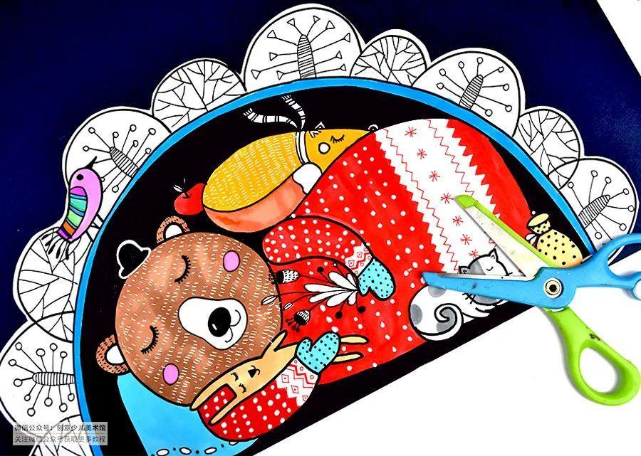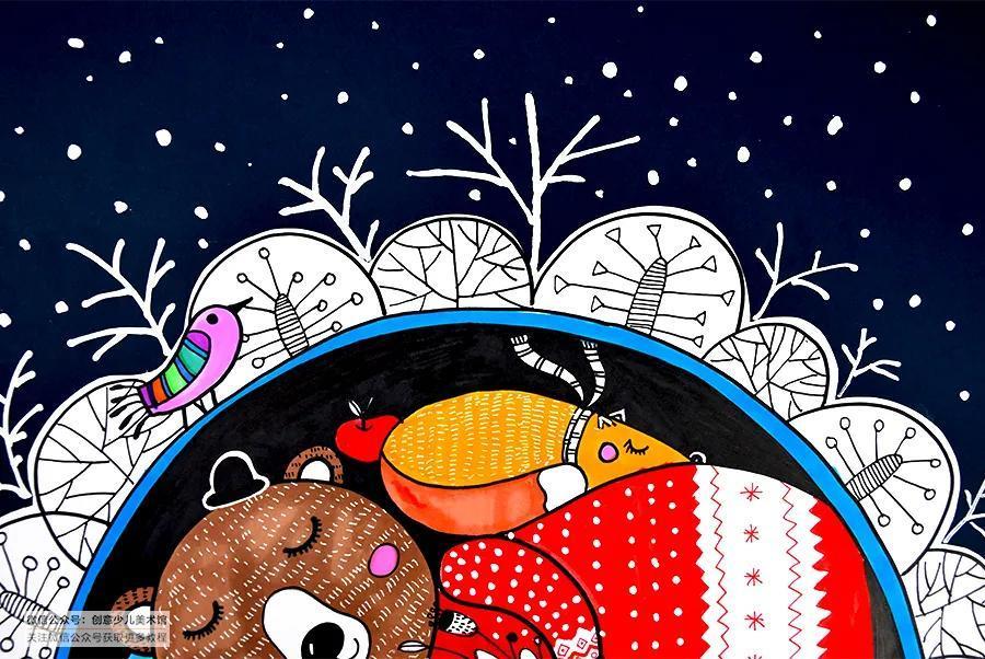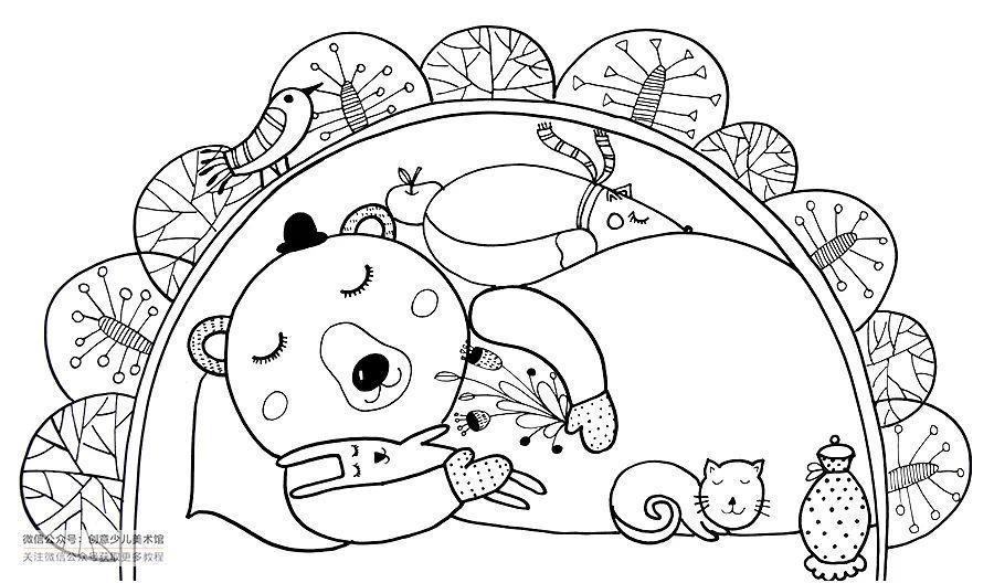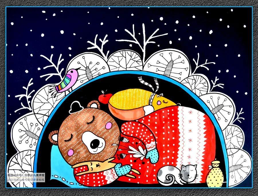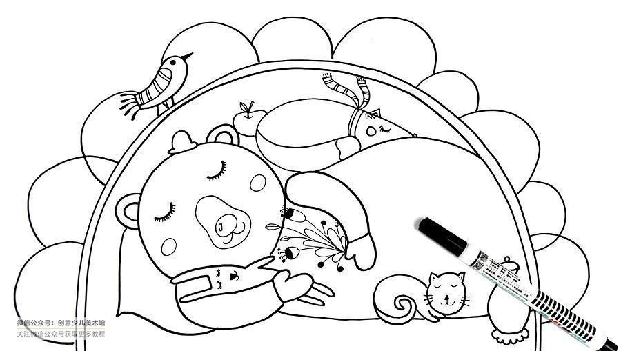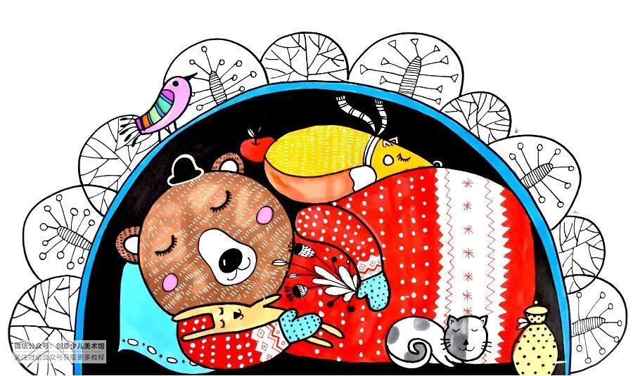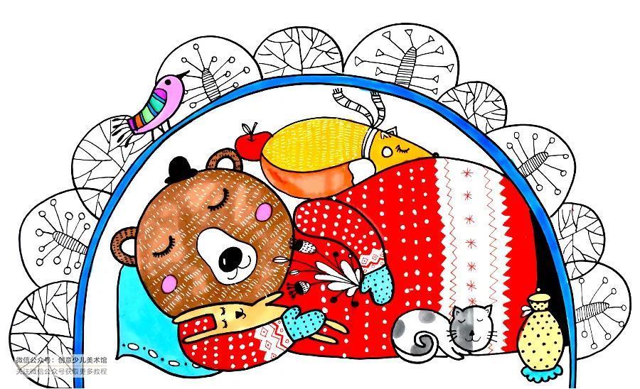 儿童画教程 | 线描与色彩的想象画《小熊宝宝在冬眠》