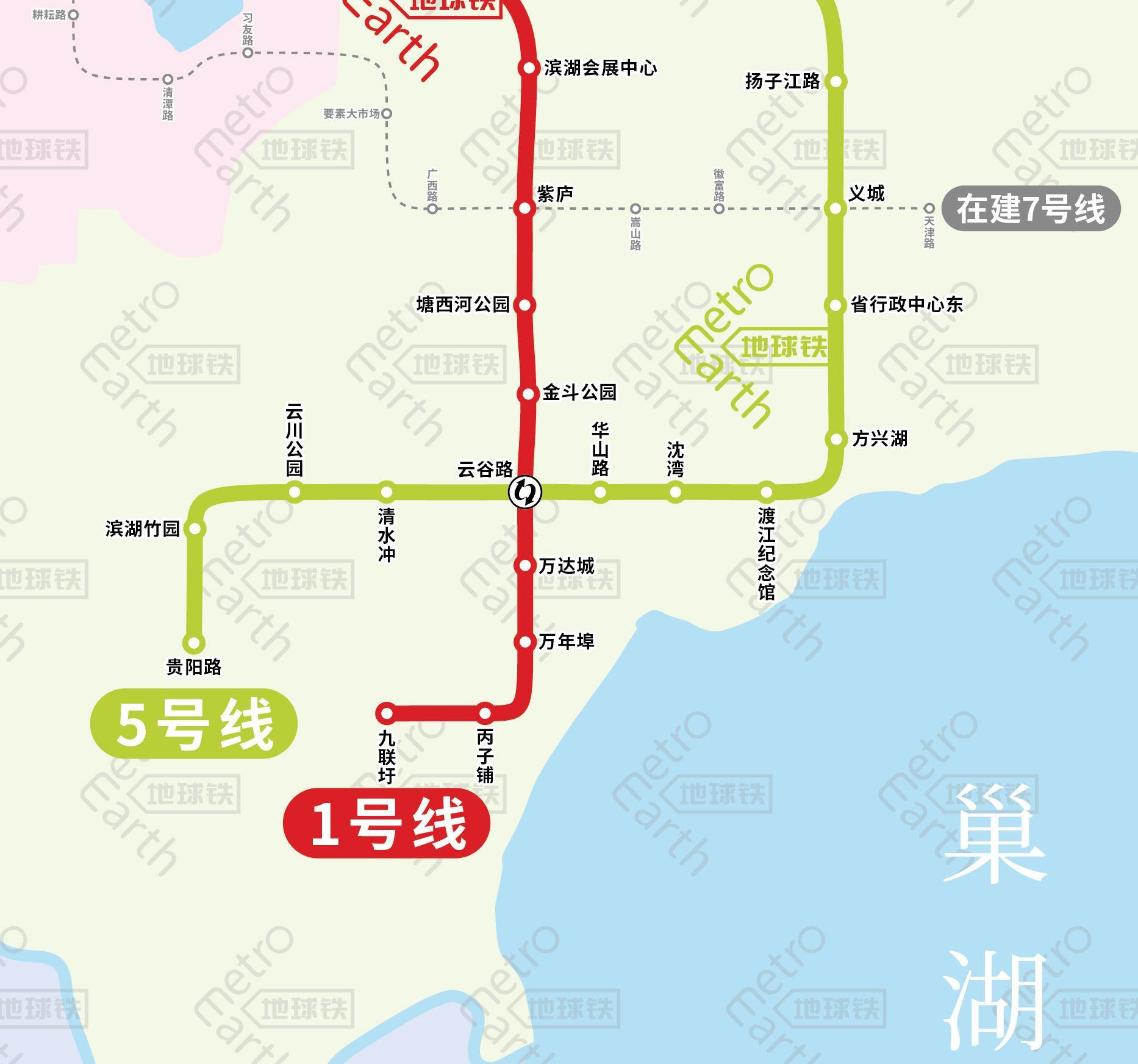 1号线、5号线在临近巢湖区域并行,且在云谷路交汇换乘。在建的7号线未来也会在这片区域与这两条线相交。