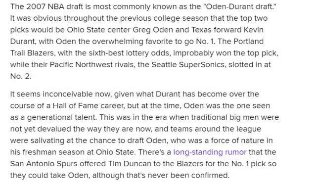 美媒重排07选秀顺位!杜兰特当选状元无悬念,48轮秀逆袭成榜眼
