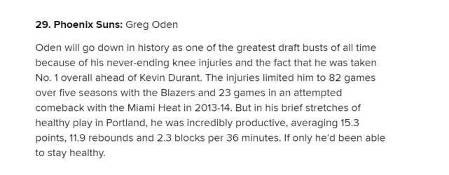 第五顺位:乔金·诺阿(实际顺位9)诺阿刚进联盟的时候并不出色,新秀赛季也只能够交出场均6.6分,5.6个篮板,1.1次助攻的数据。不过到了生涯的第三个赛季诺阿便开始爆发了,这个赛季诺阿场均可以交出10.7分,11个篮板,1.6次盖帽的全面数据,成为了联盟最出色的中锋之一。当然了,诺阿最出色的赛季则是在2013-2014赛季,这个赛季诺阿拿到了最佳防守球员,并在MVP的评选中排在第四位。不客气地讲,健康的诺阿无疑是最优秀的内线球员之一,他拥有非常出色的防守能力和串联能力。但遗憾的是,伤病早早地找上他。