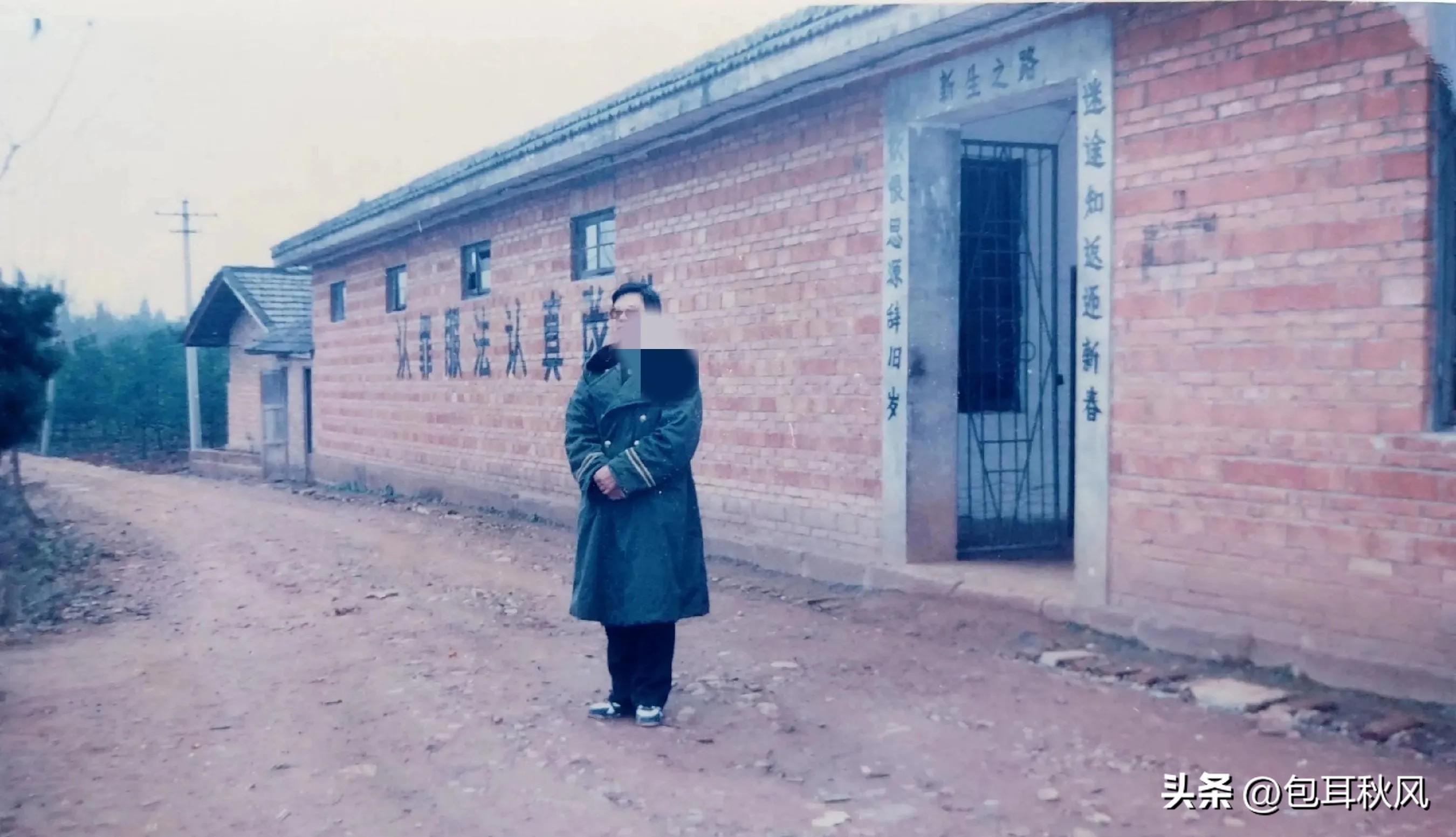 当年在拘役所监舍外的留影。那时树木还小,现在已经被大树包围。墙上标语:认罪服法认真改(造)。门上有一幅对联,上联下联模糊看不清楚,只认得横批是:新生之路四个字。