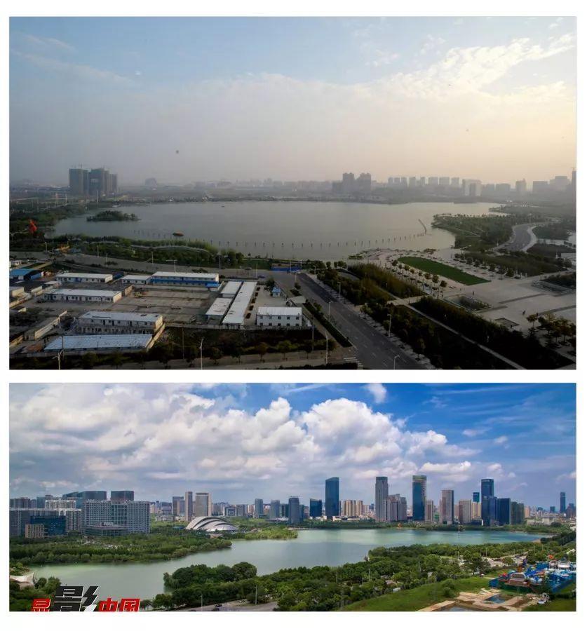 上图:2010年4月合肥天鹅湖边,很多建筑还没有建起来;下图:2017年7月的天鹅湖风貌。作者:王从启(上)、王韶斌(下)