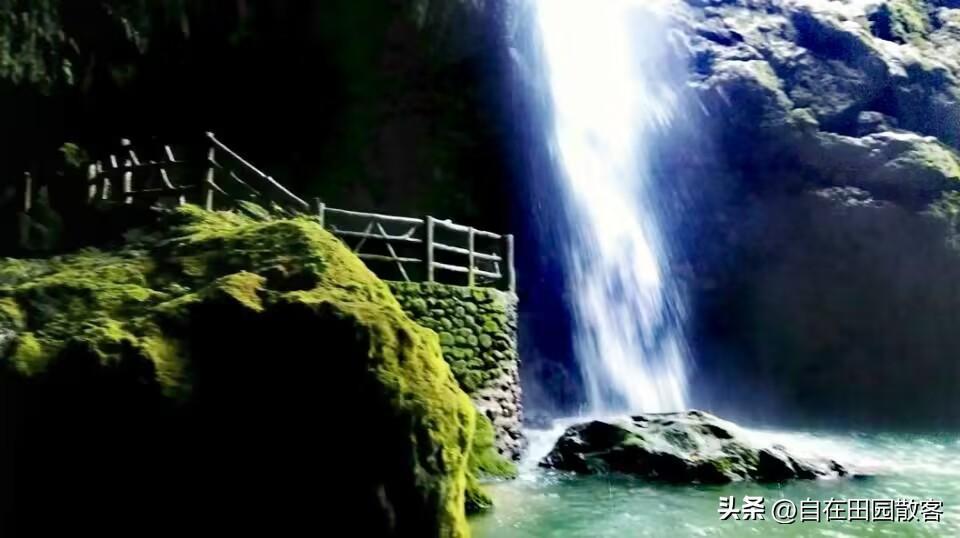 洞中瀑布。通灵大瀑布跌落的深潭边有一个巨大的溶洞,洞内景色奇异,一条高达188米的瀑布从溶洞上方沿岩壁飞流直下,呈九级跌落,汇入鸳鸯潭,与大瀑布一起消失在深不可测的地下河里。