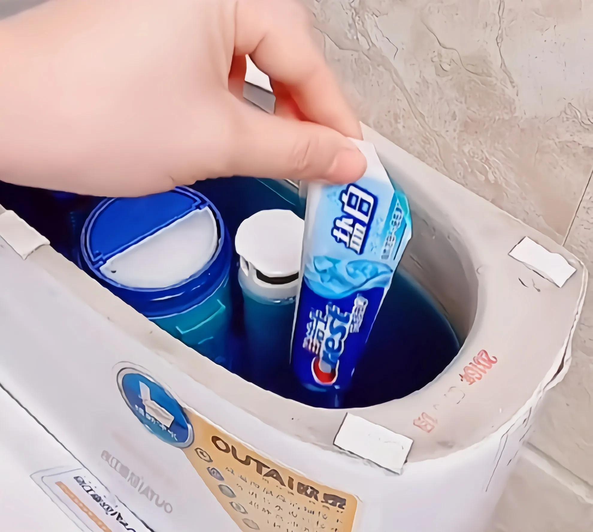 9、拿一个牙膏,用剪刀剪个小口,放入马桶,这样冲洗出来的马桶一年都没有异味。