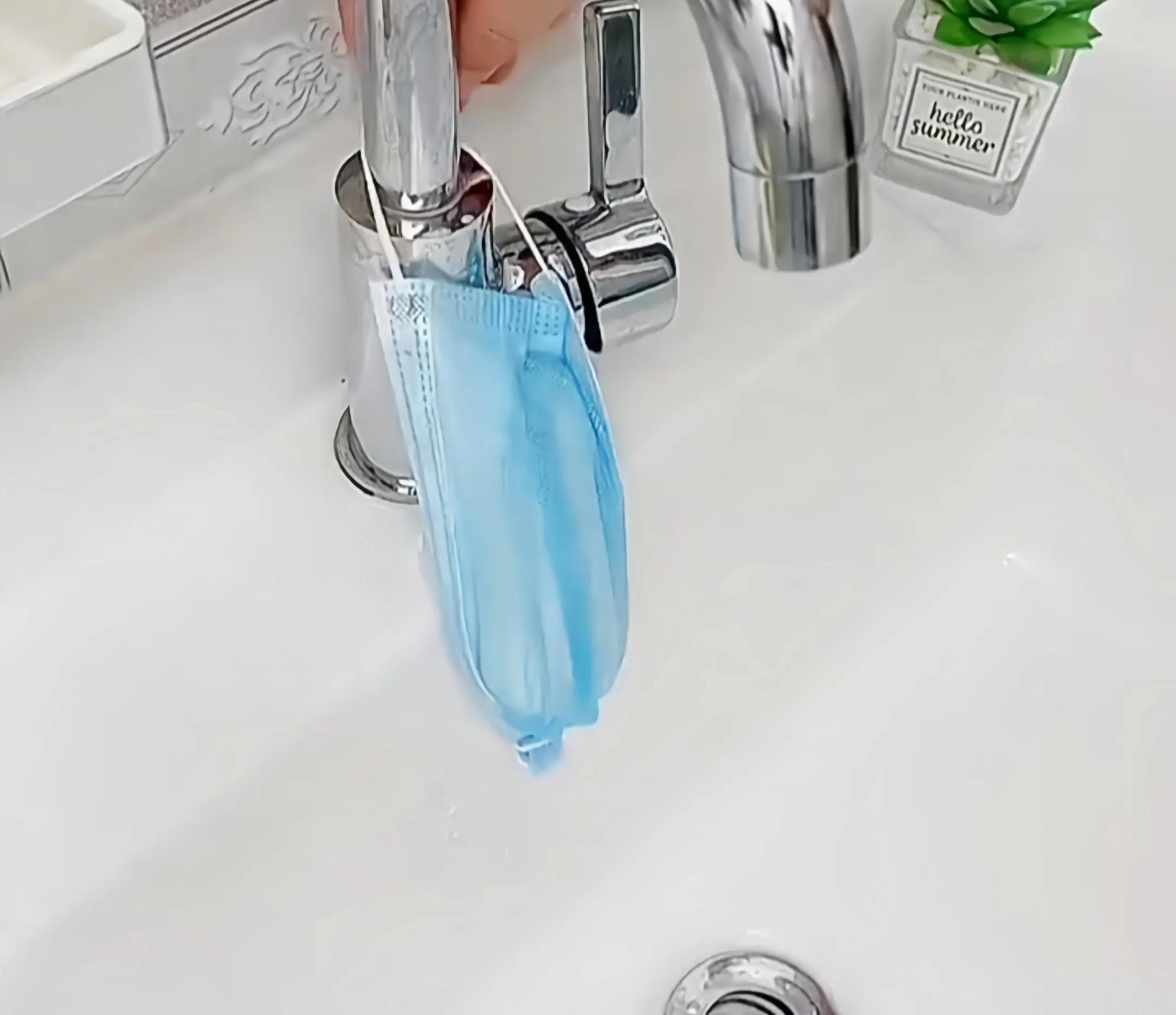 3、用完的口罩先别扔,还有这些妙用,用剪刀把口罩一头剪开,把香皂放进去绑个结,把剪开的位置扎好,挂在水龙头上,方便洗手,丢进冲水箱冲厕所没有异味。
