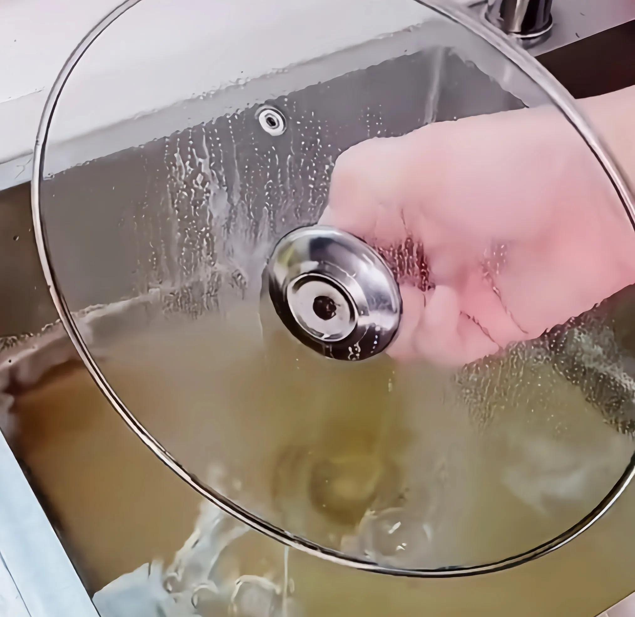 11、水中加入牙膏、洗洁精、白酒、小苏打、白醋放入锅盖,静置十分钟,溶解油污,轻松摇晃锅盖,干干净净。