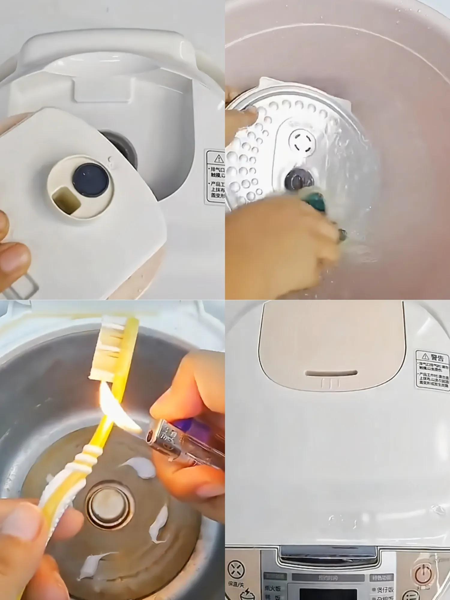 13、电饭煲要经常清洗,做米饭才会香香,把电饭煲的排气阀拿下来,能看到很多的食物残渣,特别脏,接下来把盖板拿下来,也能看到很多的食物残留,我们准备一盆60度的热水,然后里面加入白醋和洗洁精给它搅拌均匀之后,把排气阀和盖板泡下去,泡个五分钟左右,拿百洁布就能给它刷掉了,顺带把这个密封条也给它刷一刷,否则咱们蒸出来的米饭也会有一股霉味,刷完之后用清水给它投洗两遍,放在一边晾干就可以了,再一个要清洗电饭煲的发热盘,这个时候一定要不要用水啊?你可以挤上适量的牙膏,用打火机把不用的牙刷直接给它烧一烧,这样用起来也比较的方便,用牙刷刷完之后,拿百洁布一擦就干干净净了,再把其它没有清理过的地方都给它清理一下,全部清理完晾干了以后,再把盖板和排气阀都装上就完工了。你学会了吗?