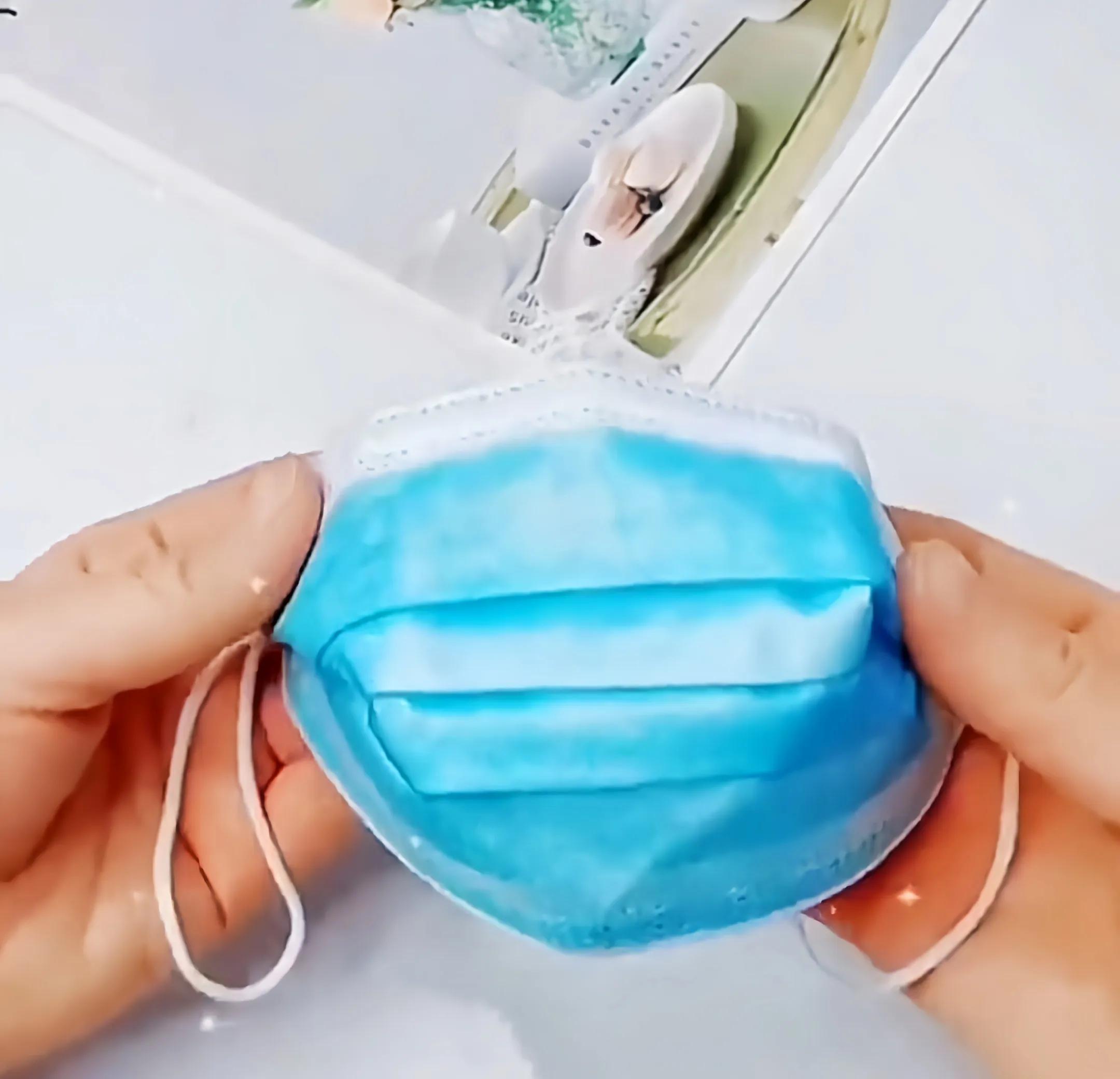 7、买的口罩太大,这样叠秒变儿童口罩,口罩一角对折,在延边对其折叠,把挂耳绳打个结,尽量拉紧,另一半也一样,这样不会侧漏,和孩子脸型也更贴合。