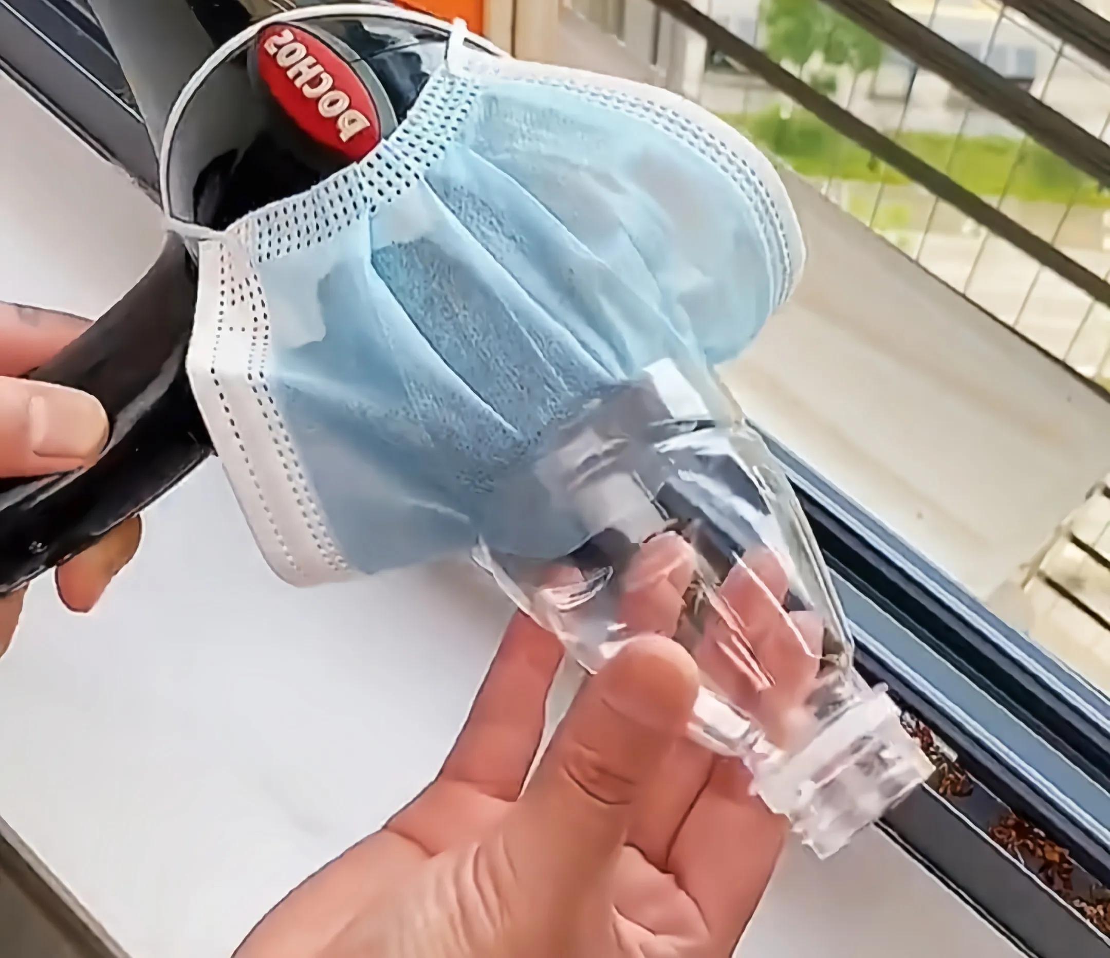6、把不用的口罩套在吹风机上,尾部加个矿泉水瓶,对着窗台缝隙,这样垃圾毛发就全部吸干净了。