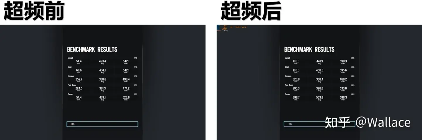 超频前平均帧423.4,超频后平均帧441.9,提升4.3%: