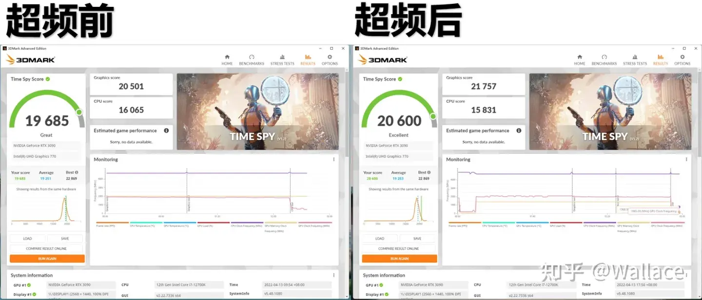 基准测试采用3Dmark Time Spy,超频前GPU得分为20501,超频后GPU得分为21757,提升6.1%。