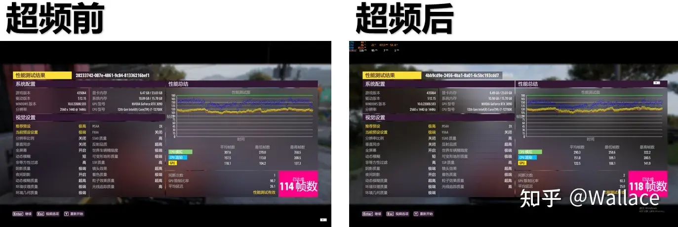 超频前平均帧114,超频后平均帧118,提升3.5%: