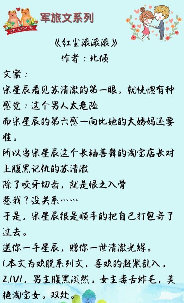 今天推荐几部好看的军旅言情文,军旅文写的好看的作者有苏格兰折耳猫,代表作有《长冬》,《军婚的秘密》,《鹤群》,《你好,中校先生》等。作者沐清雨,代表作有《时光若有张不老的脸》,《春风十里,不如你》等。作者折纸蚂蚁,代表作有《爱能成魔能成疯》,《军装下的绕指柔》,《带你去偷欢(高干)》等。除了这几个作者的,下面这几部军旅文也很好看,推荐给大家。