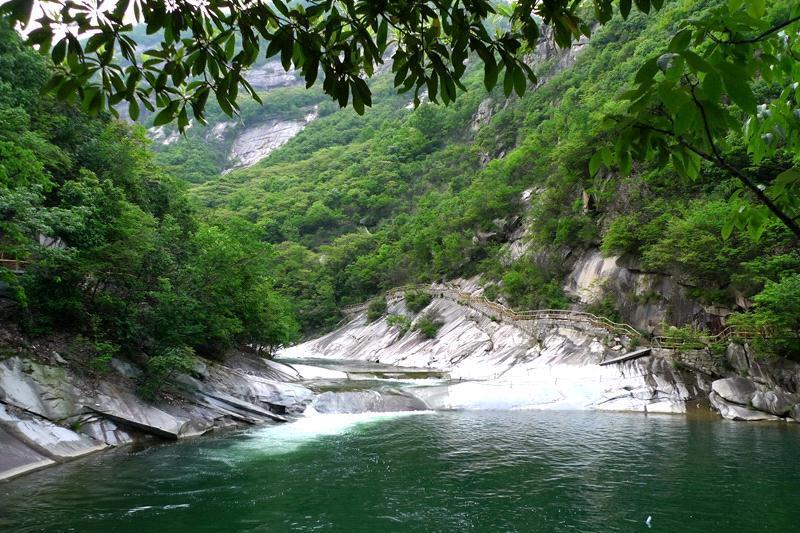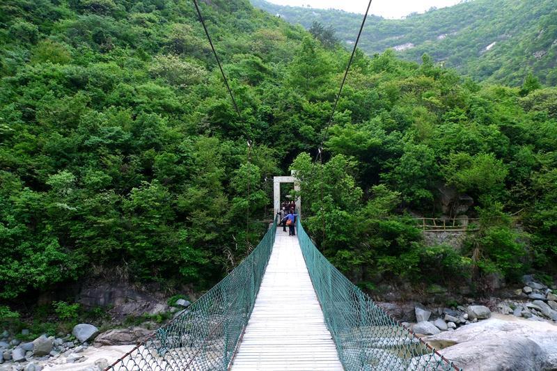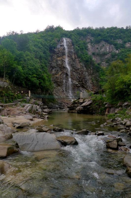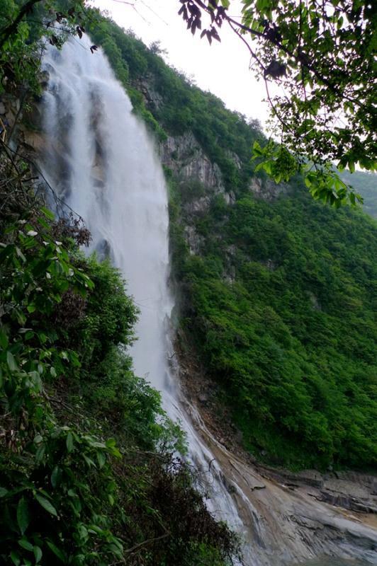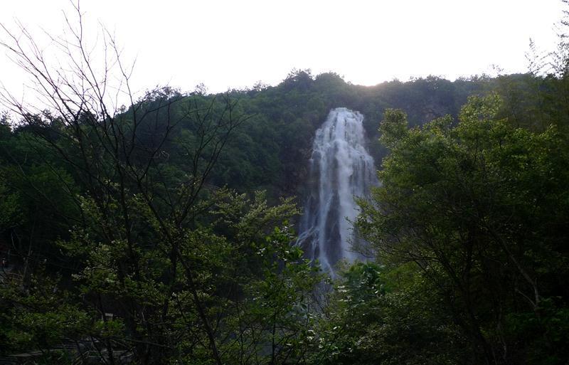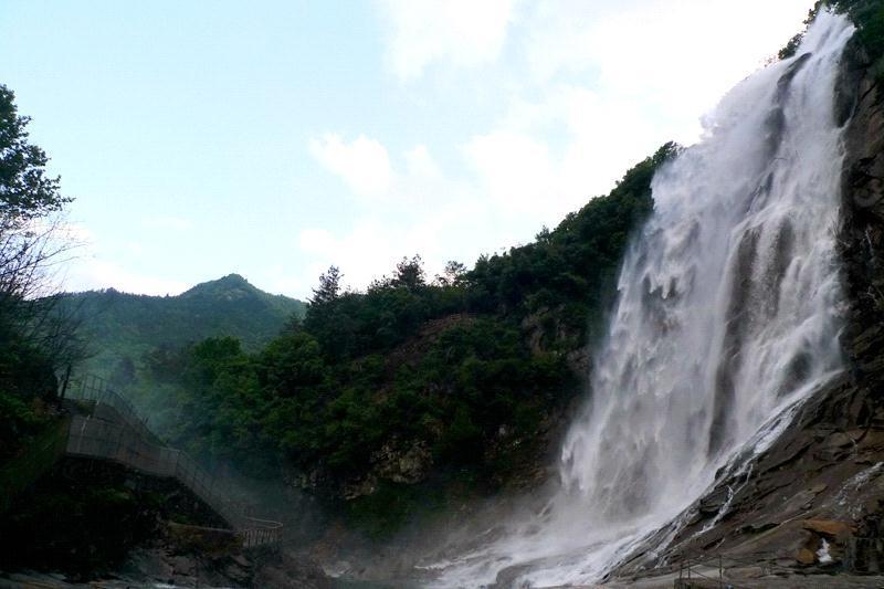 沿着峡谷栈道徜徉,景色清幽,心境舒缓。在水面宽阔处,穿越一条山洞下行,便可望见高约百米宽约30米的瀑布飞泻而下,玉珠四溅,声震群山。