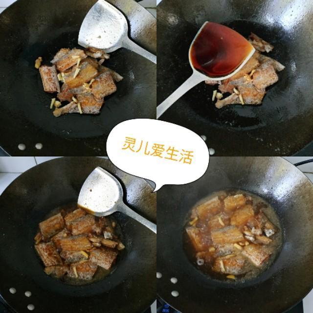 6:锅清理干净后,把煎炸好的带鱼倒进锅里,倒一锅铲生抽,半锅铲料酒,生姜片三四片,再倒入没过鱼块的开水,炉上开中火盖上锅盖焖烧。