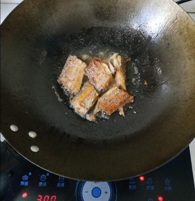 5:把煎好的鱼块都盛起放盘里,锅里的油倒掉不要。